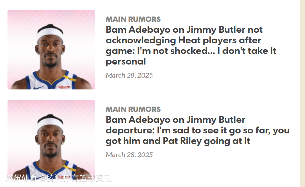 2025-03-29 07:00北京时间3月29日,热火队球员阿德巴约接受媒体采访,谈到了前队友吉米-巴特勒。在此前双方交手时,阿德巴约和巴特勒除了在比赛过程中被迫相互致意之外,从未相互致意。