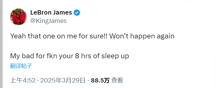 詹姆斯的好友CuffsTheLegend写道:“拜托了,勒布朗!那TM什么鬼?!我要睡觉了,哥们!”詹姆斯回复道:“没错,那次肯定是我的错!!不会再发生了。很抱歉搅黄了你八个小时的睡眠,我真是太不应该了!”