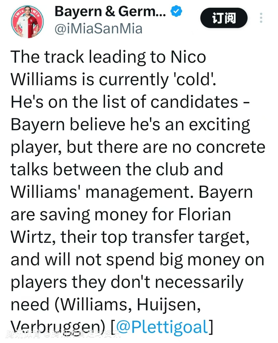 普莱滕贝格指出,尼科-威廉姆斯的情况目前处于搁置状态。虽然他被列入拜仁的潜在引援名单,且被认为是一名极具潜力的球员,但俱乐部与他之间尚未开启实质性谈判。