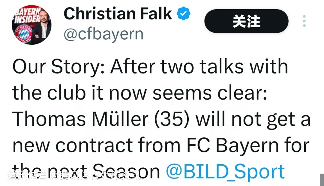 法尔克指出,在与俱乐部进行了两次会谈之后,情况似乎已经明朗:托马斯-穆勒不会得到拜仁的新合同。这意味着他下赛季将不会继续为拜仁效力。