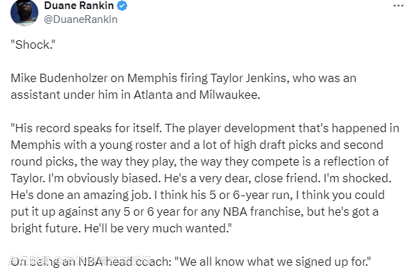2025-03-29 08:00北京时间3月29日,灰熊队官方宣布炒掉主教练泰勒-詹金斯。太阳队主教练布登霍尔泽在今日赛前接受采访时谈到此事,并表示自己对于灰熊队的操作感到震惊。