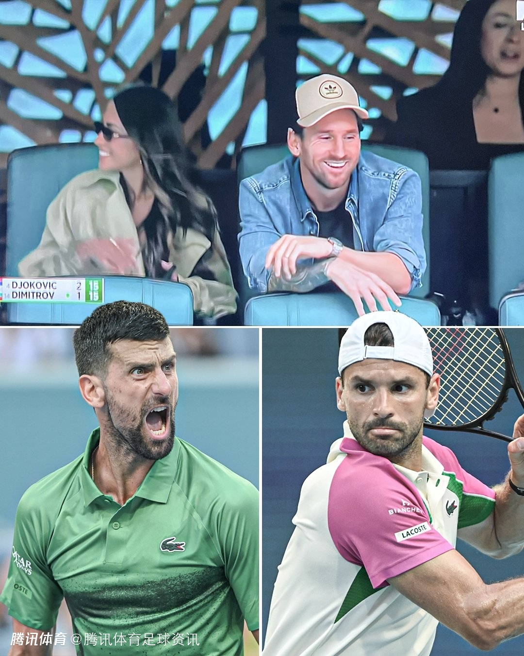 当场比赛中,德约科维奇以6-2、6-2的比分轻松战胜迪米特洛夫。梅西和夫人安东内拉都来到现场观战。