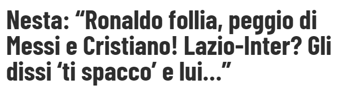 内斯塔回忆道:“罗纳尔多的实力超越众人。我在球场上曾与梅西直接交锋,也和年轻时的C罗有过对战,不管是他在皇家马德里,还是还在曼联的时候。在那场拉齐奥对阵国际米兰的比赛里,当我躺在那张广为人知的照片中的地上时,那简直如同噩梦一般。那场决赛毫无悬念,因为国际米兰虽说拥有像萨内蒂等一众优秀球员,算得上一支实力不俗的球队,但当那个家伙拿到球的瞬间,整个球场都被他的魅力所点燃!那种场面实在疯狂,是一种令人难以言喻的震撼感受。”