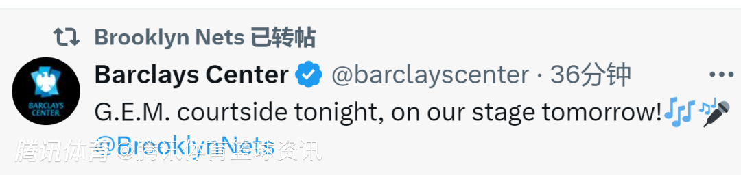 巴克莱中心官方推特还写道:“邓紫棋今晚在球场边,明天在我们的舞台上(邓紫棋将在明日在巴克莱中心举办个人演唱会)。”