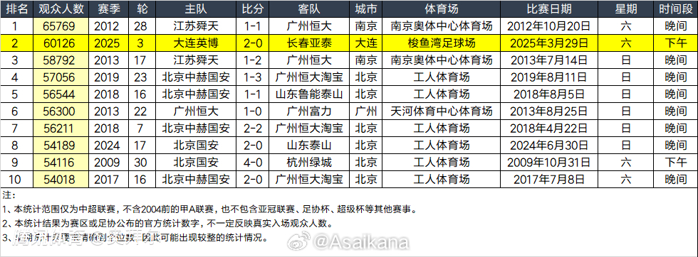 媒体人朱艺指出,“作为著名的人气赛区,今天晚间工体也将迎来今年第一场中超,也有望对榜单发起冲击。”在2024赛季,工体场均观众人数达到46444。