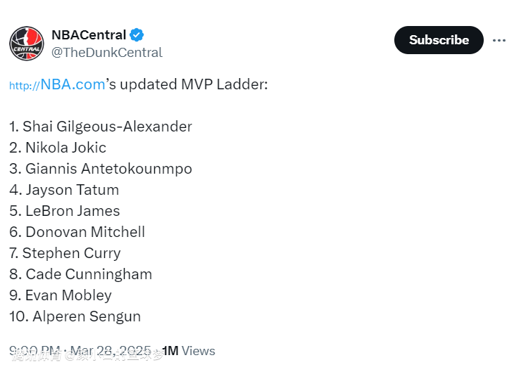 不过最新一期的NBA官方MVP榜单还是给了詹姆斯联盟第五的位次,毕竟湖人还是西部前四,詹姆斯仅次于SGA、约基奇、扬尼斯、塔图姆,40岁的老头还是联盟最顶级的存在。