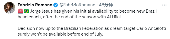 罗马诺:新月主帅热苏斯已同意接手巴西队 但足协依旧在等安切洛蒂回复