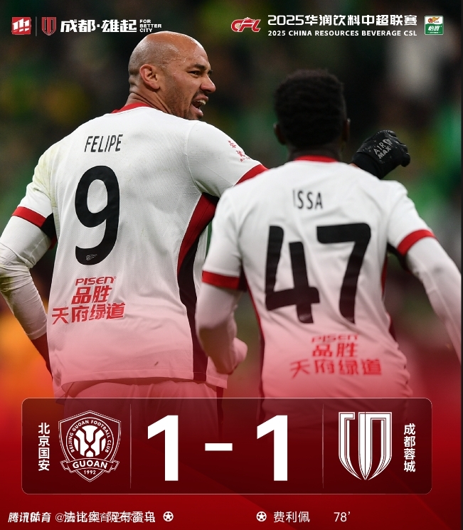 本场比赛,刚开场成都蓉城就反客为主,多次下底传中,但未能形成进球。第11分钟,杨立瑜左路突破到禁区被元敏诚放倒,主裁判马宁判罚点球,法比奥主罚命中,国安1-0领先。之后国安控球率占优,但有效攻势不多。下半场第57分钟,胡荷韬沿着右路内切,随后他的射门稍稍踢偏。第67分钟,恩加德乌因犯规被马宁出示红牌罚下,国安被迫以十人应战。第78分钟,费利佩在禁区内左脚捅射破门,将比分扳平。此后成都队继续进攻,卡隆远射中楣,韩佳奇多次神勇扑救,力保球门不失。最终,双方1-1握手言和。