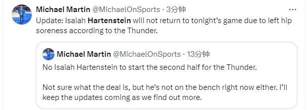 2025-03-30 10:00北京时间3月30日,NBA常规赛继续进行,雷霆队对阵步行者队。本场比赛,雷霆队中锋哈尔滕施泰因在下半场开始后没有出现在首发阵容中,也没有出现在替补席。随后雷霆队更新信息,宣布哈尔滕施泰因左臀部酸痛,本场比赛将不会回归。
