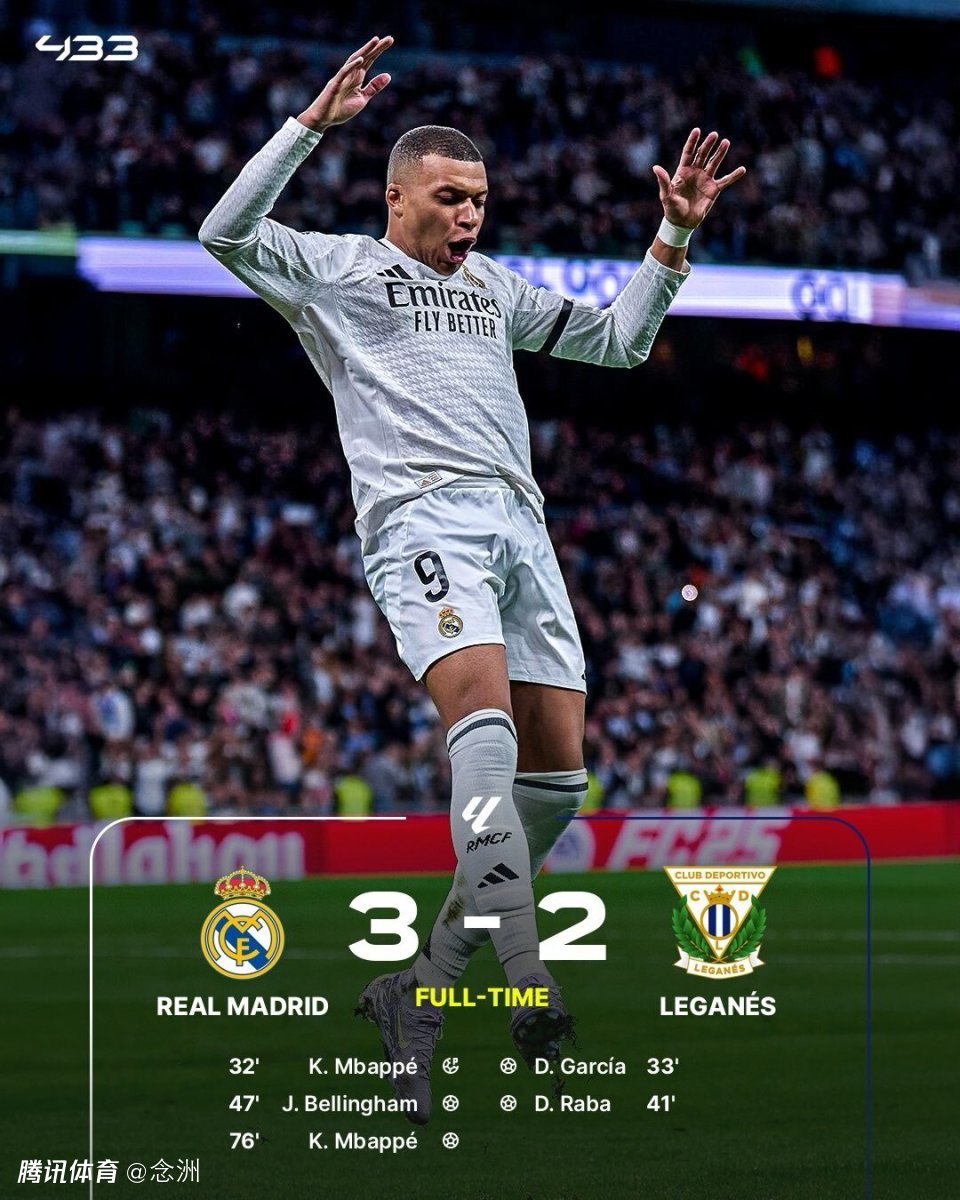 西甲第29轮,皇马主场3-2险胜莱加内斯,联赛三连胜,在先赛一场的情况下积分追平榜首巴萨,排名第二。居莱尔造点,姆巴佩点射,迭戈-加西亚迅速扳平,丹尼-拉巴破门反超,贝林厄姆建功,姆巴佩间接任意球梅开二度。
