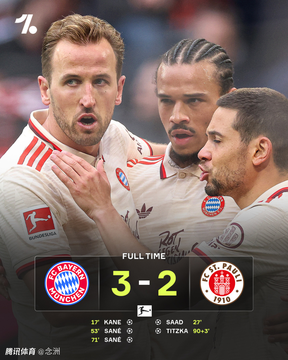 德甲第27轮,拜仁主场3-2击败圣保利,近3轮首胜。奥利塞助攻凯恩破门,利亚斯-萨德扳平,凯恩进球被吹,凯恩传射,萨内双响,奥利塞助攻双响,里茨卡打入一球。