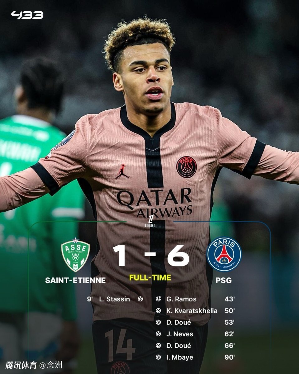 法甲第27轮,巴黎圣日耳曼客场6-1大胜圣埃蒂安,21分领跑,下轮打平就夺冠。斯塔辛首开纪录,贡萨洛-拉莫斯点射扳平,克瓦拉茨赫利亚扩大比分,内维斯破门,杜埃梅开二度,姆巴耶打进一球。