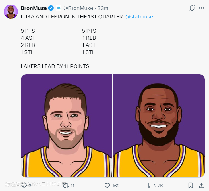 末节开场灰熊一波12-5打停湖人,詹姆斯与东契奇连拿8分再度拾回领先,灰熊缩小到3分雷迪克暂停。詹姆斯造韦尔斯犯规两罚全中,老詹助攻得手,湖人开始掌控局势,三J抢了一个三分,阿尔达马失误比赛完结。