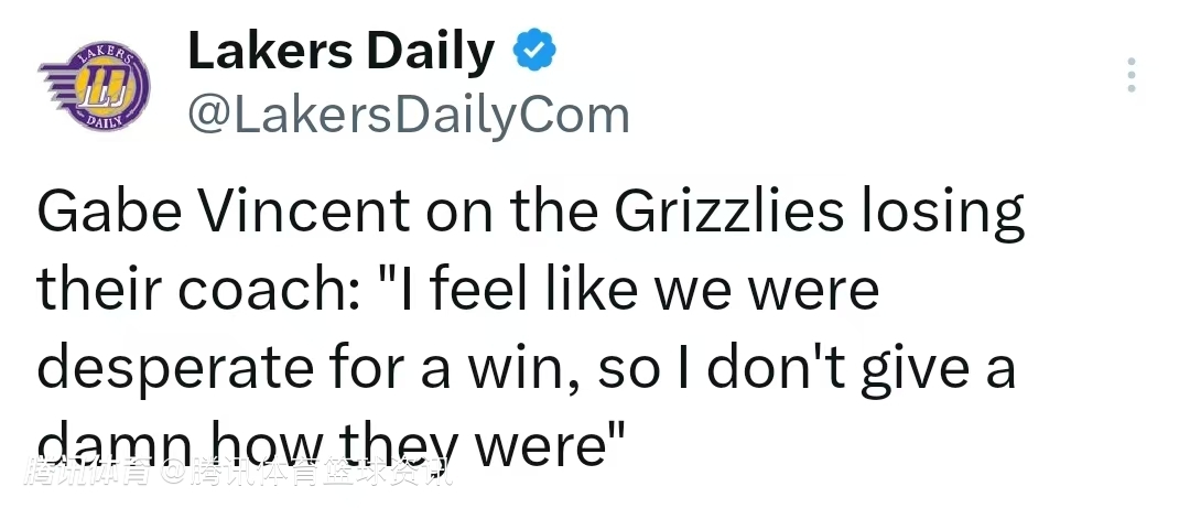 谈及灰熊队失去他们的教练一事时,文森特表示:“我觉得我们目前极度渴望一场胜利,所以我根本不在乎他们(灰熊队)当时情况如何。”