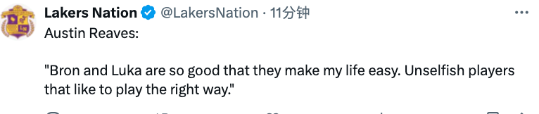 里夫斯感慨道:“詹姆斯和东契奇的伟大之处在于,他们总能让比赛变得简单,两位无私的领袖始终坚持以正确方式打球,更拥有令人叹为观止的传球视野。”