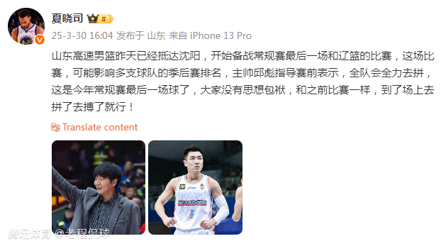 “山东高速男篮昨天已经抵达沈阳,开始备战常规赛最后一场和辽篮的比赛,这场比赛,可能影响多支球队的季后赛排名,主帅邱彪指导赛前表示,全队会全力去拼,这是今年常规赛最后一场球了,大家没有思想包袱,和之前比赛一样,到了场上去拼了去搏了就行!”该媒体人在社媒上写道。