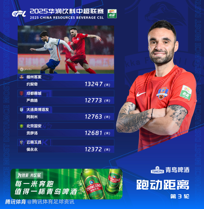 中超第3轮跑动距离排行榜:梅州客家外援约契奇以13247米排名第一