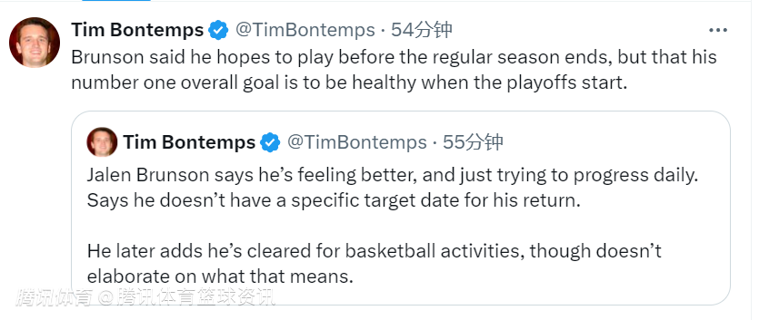 布伦森表示:“我的感觉好多了,每天都在努力取得进步,但暂时还没有具体回归日期。我已经可以参加篮球活动,希望能在常规赛结束前上场比赛,但我的首要目标是在季后赛开始时保持健康。”