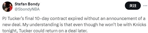 2025-03-31 07:10北京时间3月31日,根据NBA记者Stefan Bondy报道,PJ-塔克与尼克斯队的第二份10天短合同到期,但尼克斯队没有立即与塔克续约。不过由于尼克斯队内拥有空闲名额,因此他们仍然可能与塔克签约至赛季结束。