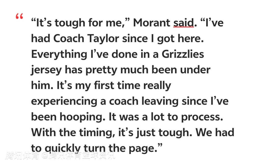莫兰特表示:“这对我而言很艰难。自从我来到这里,詹金斯教练就一直陪伴着我。我穿着灰熊队球衣所取得的一切成就,几乎都离不开他的指导。这是我打篮球以来,第一次真正经历教练的离开,有太多东西需要我去消化。而且这个时间点也很尴尬,我们必须迅速翻篇。”
