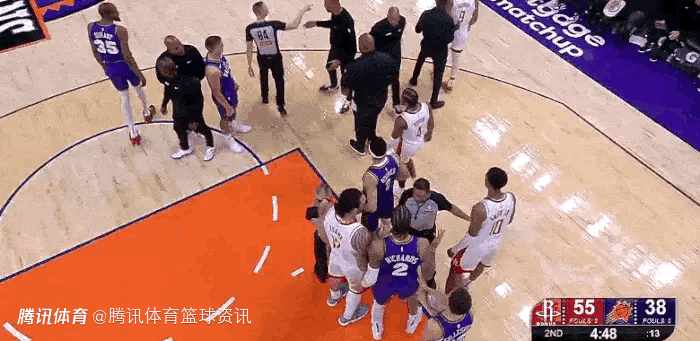 2025-03-31 10:10北京时间3月31日,NBA常规赛,火箭客场挑战太阳,比赛第二节,狄龙和杜兰特、理查兹发生冲突,吃到两次技犯被驱逐。