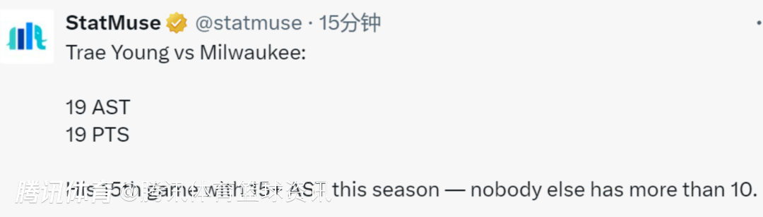 特雷-杨此役首发出战37分钟,16中4拿到19分3篮板19助攻,这是他本赛季第15次送出15+助攻,其余球员没有超过10次。