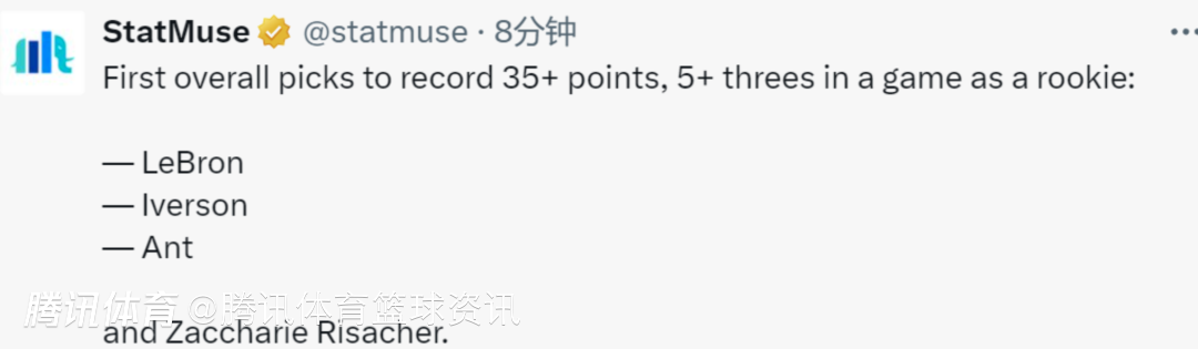 此役老鹰状元郎里萨谢首发出战34分钟,21中12,三分球11中5拿到生涯新高的36分,外带6篮板1抢断。这样一来,里萨谢也加入了詹姆斯、艾弗森、爱德华兹三人的行列,成为又一个单场拿到35+得分投中5+三分球的新秀球员。另外里萨谢目前也领跑新秀榜30+得分场次。