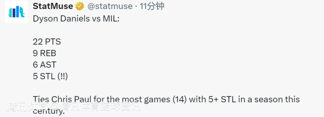 戴森-丹尼尔斯此役首发出战33分钟,15中10拿到22分9篮板6助攻5抢断,他也追平了本世纪保罗有14场比赛5+抢断的纪录。