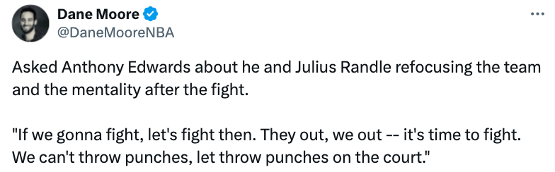 当被问及与兰德尔如何重整球队士气时,爱德华兹直言不讳:“要干架就真刀真枪地干,他们被驱逐,我们也被驱逐,那就赛场上一决高下。既然不能挥拳相向,就在球场上用实力说话。”比赛第二节,迪文琴佐反击造犯规,摔倒后和斯图尔特发生口角,随后他又和霍兰发生冲突,裁判经过回看后,将里德、迪文琴佐、森林狼助教普里吉奥尼、霍兰、萨瑟、斯图尔特和活塞主帅比克斯塔夫驱逐。
