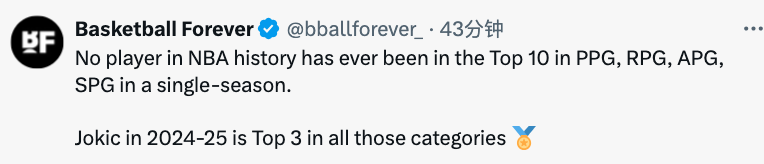 2025-03-31 11:40北京时间3月31日,据美媒Basketball Forever统计,NBA历史上从未有球员能在单赛季同时跻身得分、篮板、助攻、抢断四项数据前十,但约基奇本赛季在这四项数据方面全部高居联盟前三。