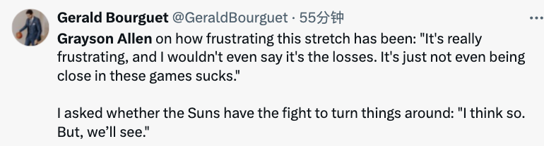 阿伦表示:“真的太让人沮丧了,而且我觉得这甚至都不是因为输球。最糟糕的是在这些比赛中我们甚至都没有接近过胜利,这太难受了。”被问及太阳是否有斗志扭转颓势,他回应道:“我觉得有,不过我们还是走着瞧吧。”
