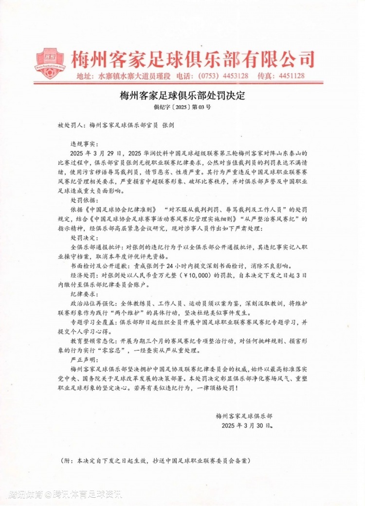 3月29日,中超联赛第三轮,梅州客家3-4不敌阵山东泰山。比赛过程中,俱乐部官员张剑无视职业联赛纪律要求,公然对当值裁判员的判罚表达不满情绪,使用污言秽语辱骂裁判员,情节恶劣、性质严重。其行为严重违反中国足球职业联赛赛风赛纪管理相关要求,严重损害中超联赛形象、破坏比赛秩序,并对俱乐部声誉及中国职业足球造成重大负面影响。