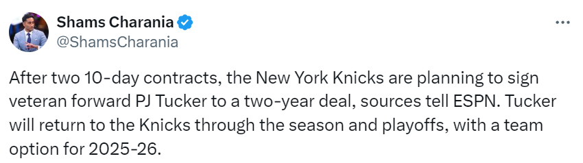 2025-04-01 06:50北京时间4月1日,据名记Shams报道,与纽约尼克斯队签下两份10天短合同后,前锋PJ-塔克预计与球队将达成一份为期两年的新合同。