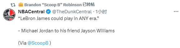 2025-04-01 07:10北京时间4月1日,据ESPN名记布兰登-罗宾逊报道,迈克尔-乔丹在高尔夫球场上与查尔斯-奥克利和杰森-威廉姆斯讨论了勒布朗-詹姆斯,谈到詹姆斯的历史地位,乔丹表示:勒布朗-詹姆斯可以在任何时代打球。
