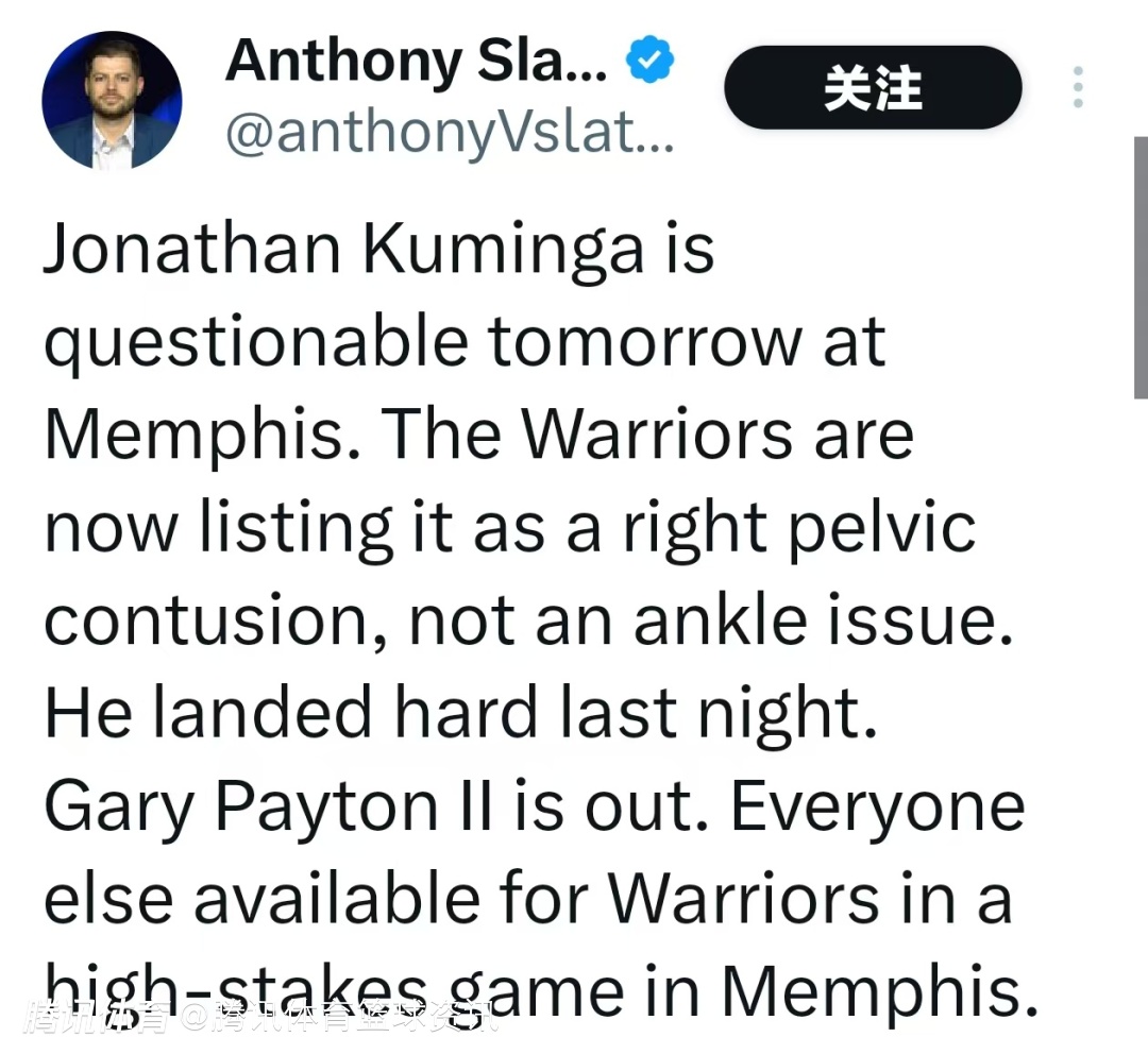 2025-04-01 07:30北京时间3月31日,据勇士队记Anthony Slater报道,在明日勇士队客场挑战灰熊队的比赛中,库明加的出战状态被列为出战成疑。