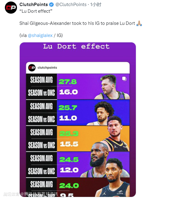 2025-04-01 08:00北京时间4月1日,雷霆队球员亚历山大更新个人社交媒体,他晒出了一张东契奇、詹姆斯等球星场均得分数据和面对雷霆时得分数据的对比图,并配文写道:“多尔特效应。”称赞队友多尔特对于这些顶级球星的出色防守。