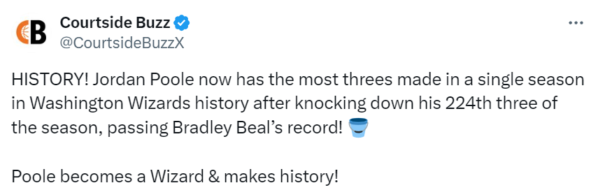 在2016-17赛季,比尔曾单赛季投中223个三分球,如今这项队史纪录已经被普尔打破,而且本场比赛还在进行中,此役过后,奇才队也还剩下7场比赛要打。这也意味着,普尔接下来还可以继续刷新自己所创下的纪录。