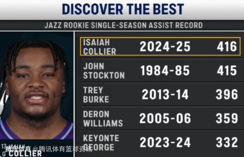 超越斯托克顿!科利尔创爵士新秀单赛季助攻新纪录 他是布朗尼大学校友