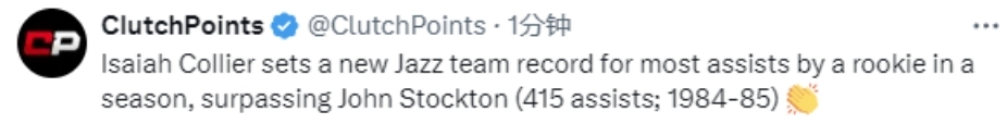 2025-04-01 09:00北京时间4月1日,NBA常规赛继续进行,爵士队对阵黄蜂队。本场比赛进行到第三节,爵士队新秀以赛亚-科利尔送出个人本场第4次助攻,本赛季个人总助攻数达到416次,超越球队名宿斯托克顿,创造爵士新秀球员单赛季助攻数新纪录。