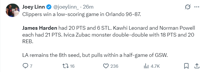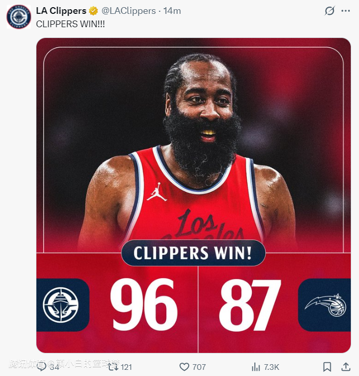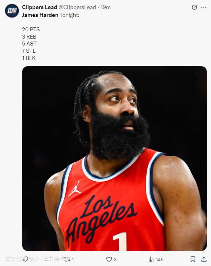 快船记者Joey Linn写道:哈登拿到20分6抢断,伦纳德21分,祖巴茨18分20篮板,快船还是排在西部第八,但与西部第六的勇士只存在不到半个胜场。