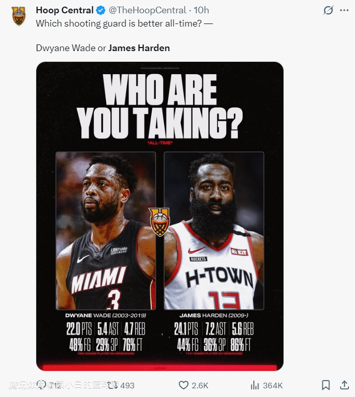 赛前美媒Hoop Central询问全世界的球迷,德维恩-韦德与詹姆斯-哈登谁是更好的得分后卫?