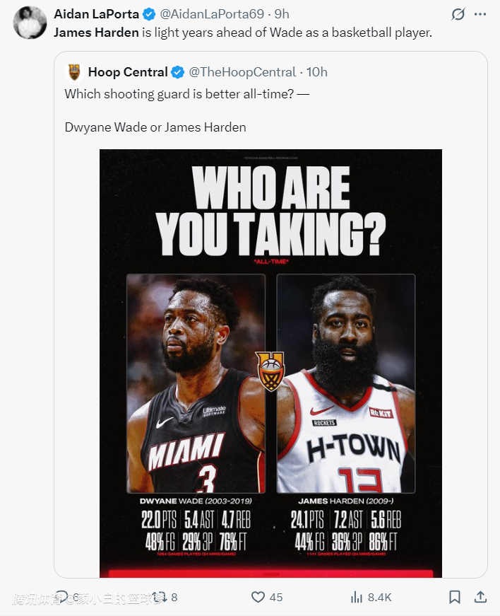 费城记者Aldan LaPorta回复:詹姆斯-哈登作为篮球运动员的实力要比韦德高出好几个档次。(这个言论引发热议,因为哈登至今没有总冠军,当然韦德也没有MVP)