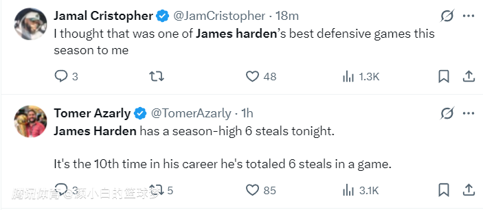 快船记者Tomer Azarly:哈登此役拼下7个抢断,这是哈登职业生涯第十场至少有6抢断的比赛。