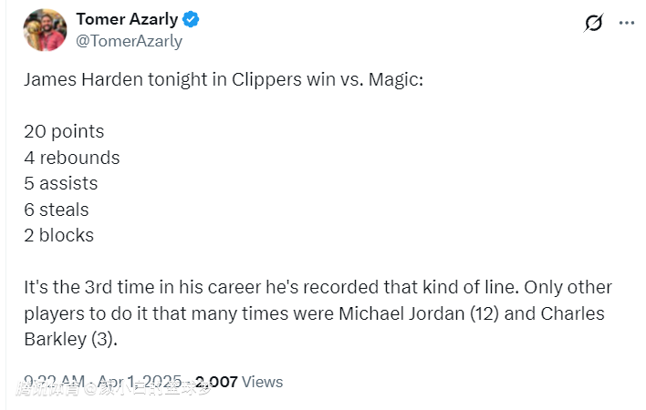 快船记者Tomer Azarly还晒出哈登20+5+7断+1帽的数据,他已经比肩了乔丹与巴克利。