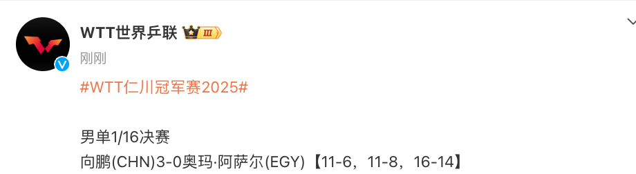 2025-04-01 12:40北京时间4月1日,WTT冠军赛仁川站男单1/16决赛,向鹏3-0阿萨尔,晋级16强。