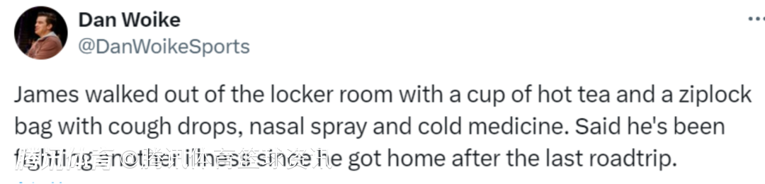 赛后,据湖人队记Dan Woike报道,詹姆斯在结束赛后采访后拿着一杯热茶和一个装有润喉糖、鼻喷雾剂和感冒药的密封塑料袋走出更衣室,詹姆斯表示自从上次客场之旅回到家中后,自己就一直在克服又一次生病。