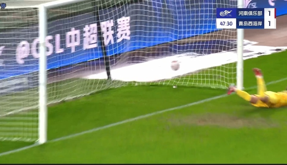 第48分钟,西海岸扳平比分,戴维森禁区内面对多人包夹巧妙外脚背一拨,段刘愚迎球直接推射飞入球网,西海岸1-1河南队。