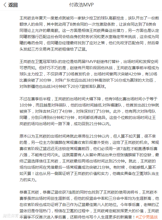 根据媒体人付政浩本赛季的多次爆料,王岚嵚去年夏天签下B类合同时,合同内有一个激励条款,奖励金额为他当赛季基本工资的50%-100%。