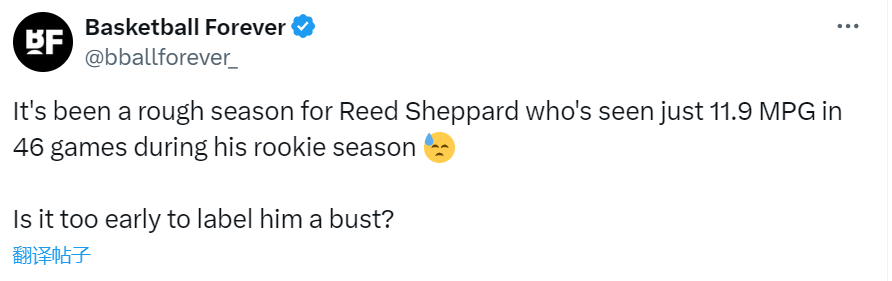 该媒体还配文写道:“对于谢泼德来说,这是一个艰难的赛季,他在新秀赛季的46场比赛中,场均上场时间仅有11.9分钟。现在就给他贴上‘水货’的标签,是不是还为时过早呢?”