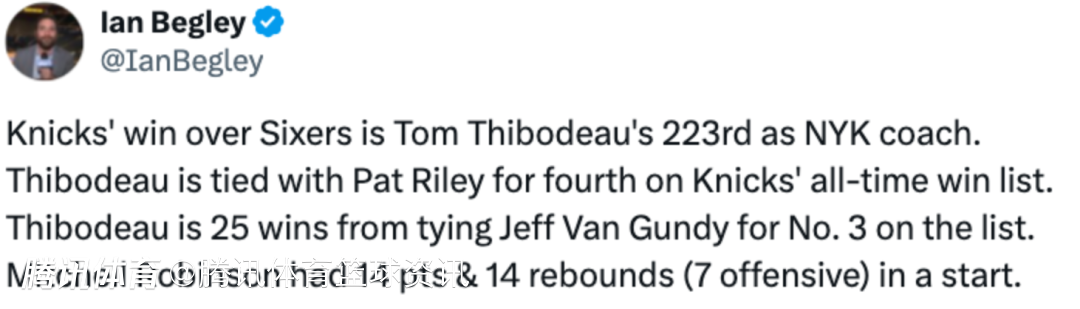 据统计,这场胜利是锡伯杜担任尼克斯主教练以来的第223场胜利,目前他在球队的历史胜场数榜单上和帕特-莱利并列第四,距离追平第三位的杰夫-范甘迪仅差 25 场胜利。